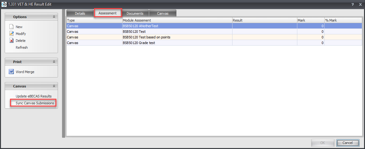 From the Canvas side panel, click on Sync Canvas Submissions. This will add the assessments to the current result.