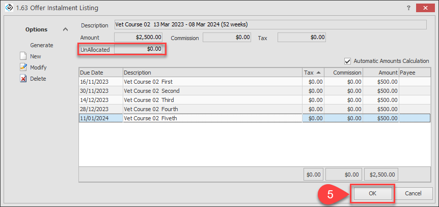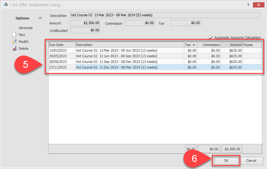 Once all instalments are created, click on OK to save.