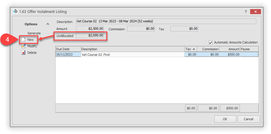Click on New in Options then enter the details for the new instalment.