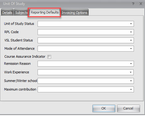 If the program is set as a PIR program (for higher education only), click on the tab ‘Reporting Defaults’ to enter the default values for the UOS that will be reported to TCSI. These values can be updated for each individual enrolment.