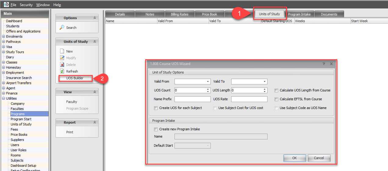 From the Units of Study panel, on the side bar’ click on ‘UOS Builder’. A pop-up window will display.