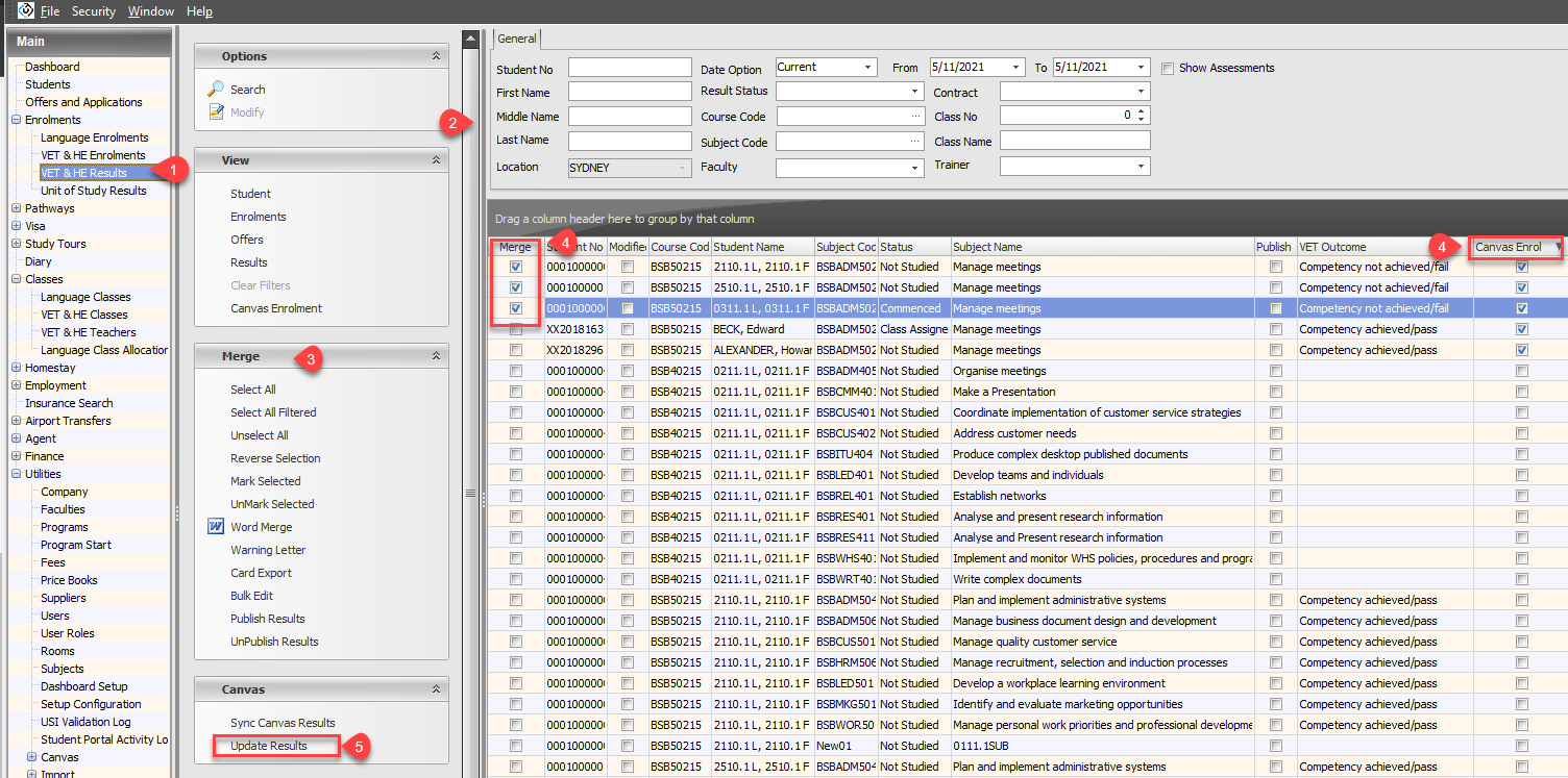 Using the Merge column, select the results that you want to update the results for. Be aware that only results that are mapped to a Canvas course can be updated. You can use the Canvas Enrol column to identify the records that can be updated.