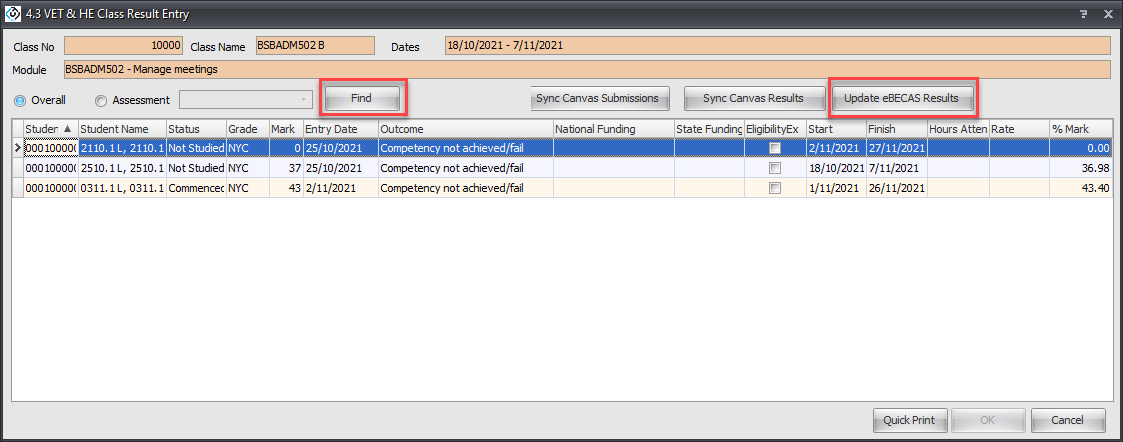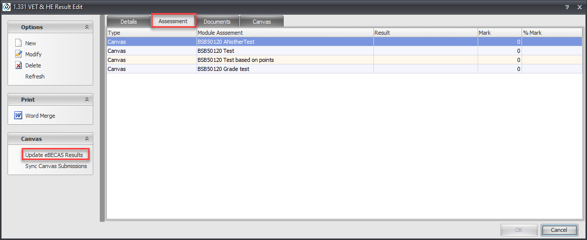 From the Canvas side panel, click on 'Update eBECAS/EDMISS Results'.