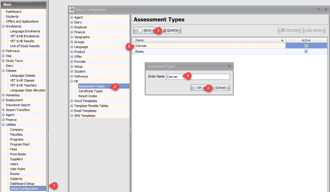 From the Setup Configuration window, go to HE > Assessment Types.