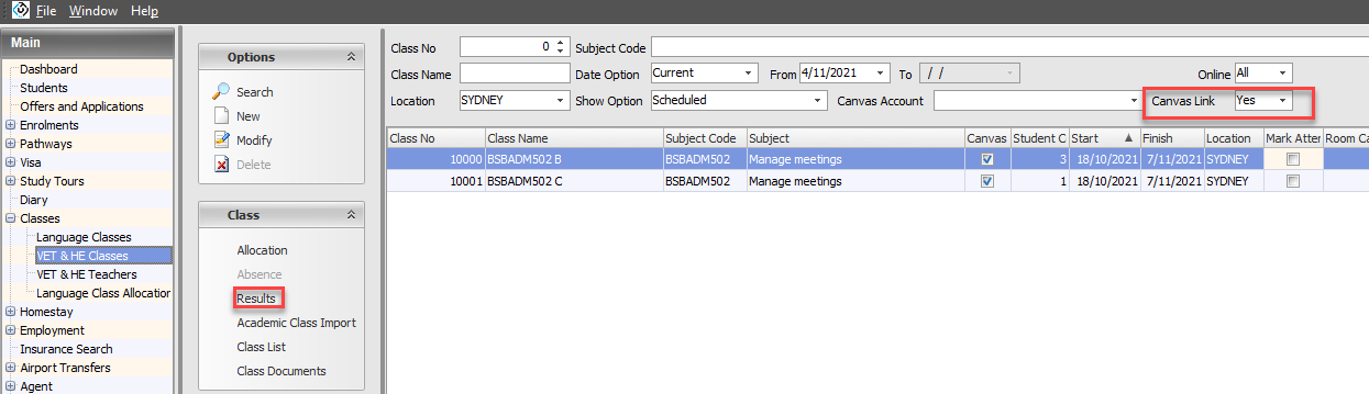 Using the filters, search for the classes of interest. Use the 'Canvas Link' filter to display only the classes that are linked with a Canvas course/section.