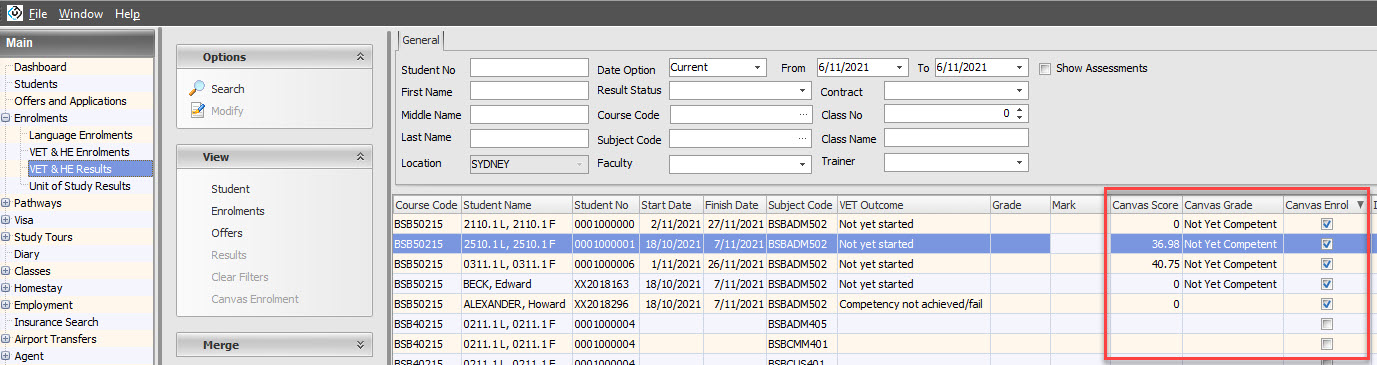 Using the Merge column, select the results that you want to update. Be aware that only results that are mapped to a Canvas course can be updated. You can use the Canvas Enrol column to identify the records that can be updated.