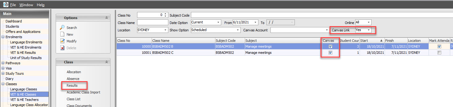 Using the filters, search for the classes of interest. Use the 'Canvas Link' filter to display only the classes that are linked with a Canvas course/section.