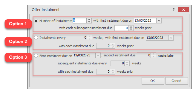 Option 3 | Set the first due date and the second due date by weeks after the first. Then set a weekly interval starting from second due date. Optionally, set weeks prior for each subsequent instalment. |
