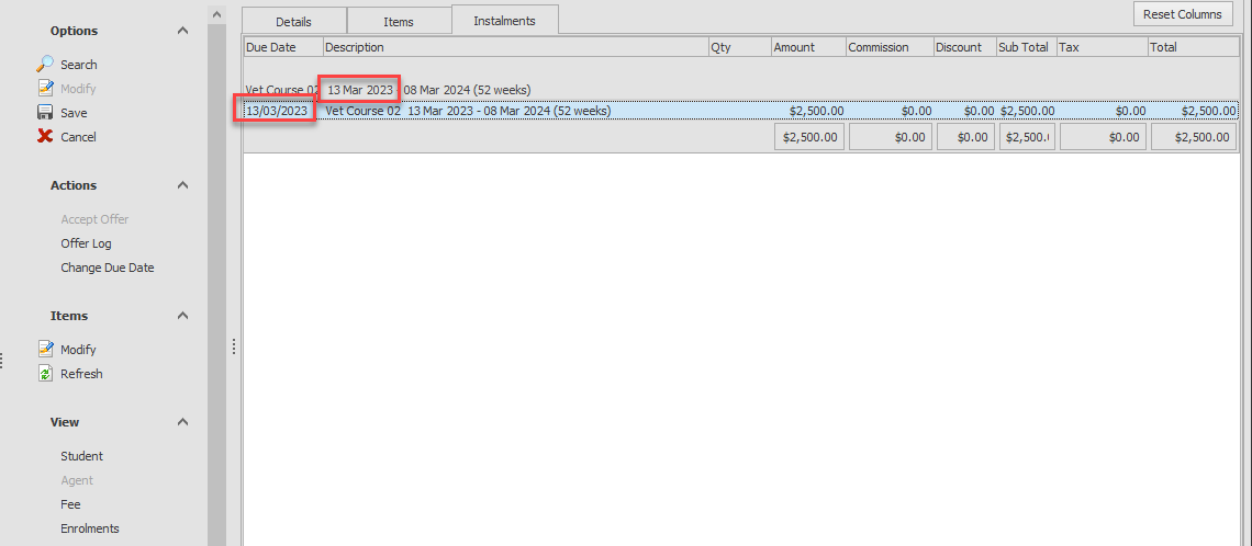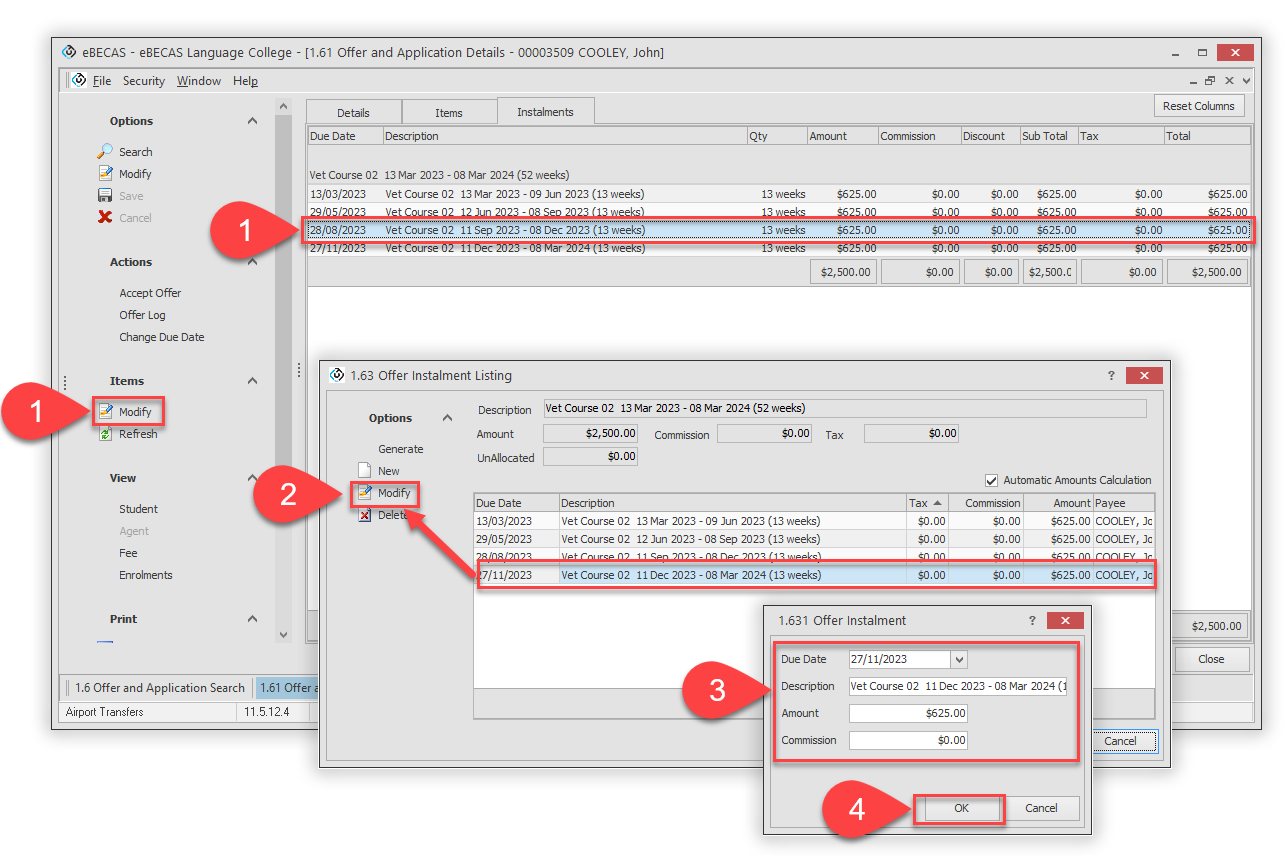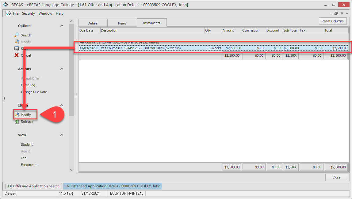 Go to the Instalments tab and click on the offer item that you’d like to view the instalments for, then click on Modify from the Items panel.
