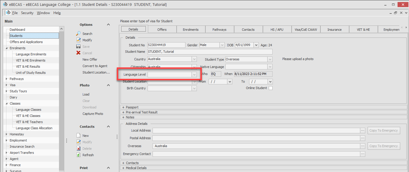 Once a student has an enrolment in a Language Course, the Student’s Language Level can be set in Student Detail. Setting the student’s Language Level will set all enrolments for that student to that Language Level.