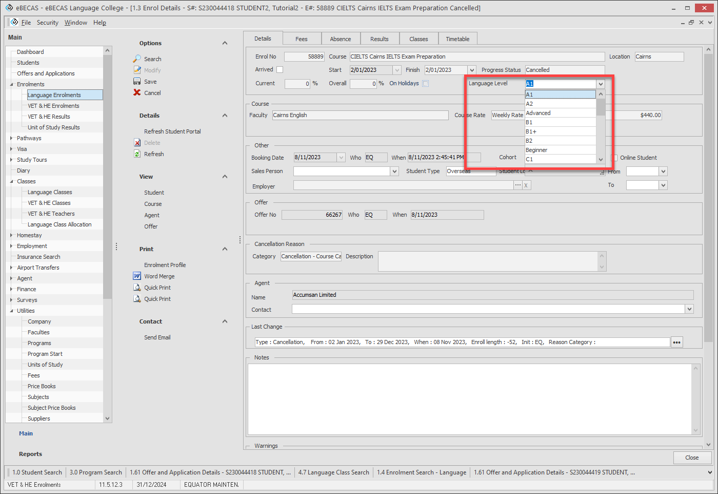 Either the Language level for just the enrolment can be updated, or the Language Level for the Student (which will also update any enrolments for that student).