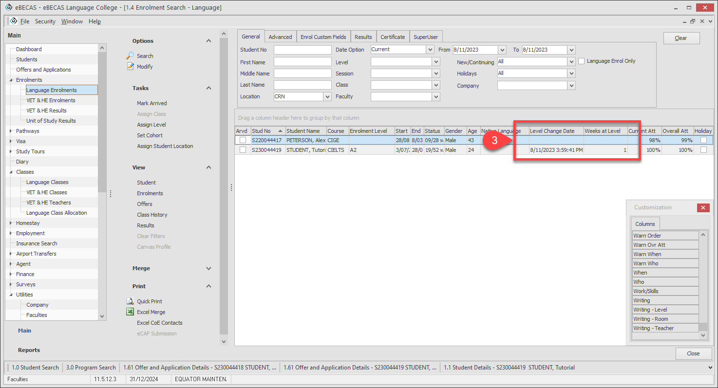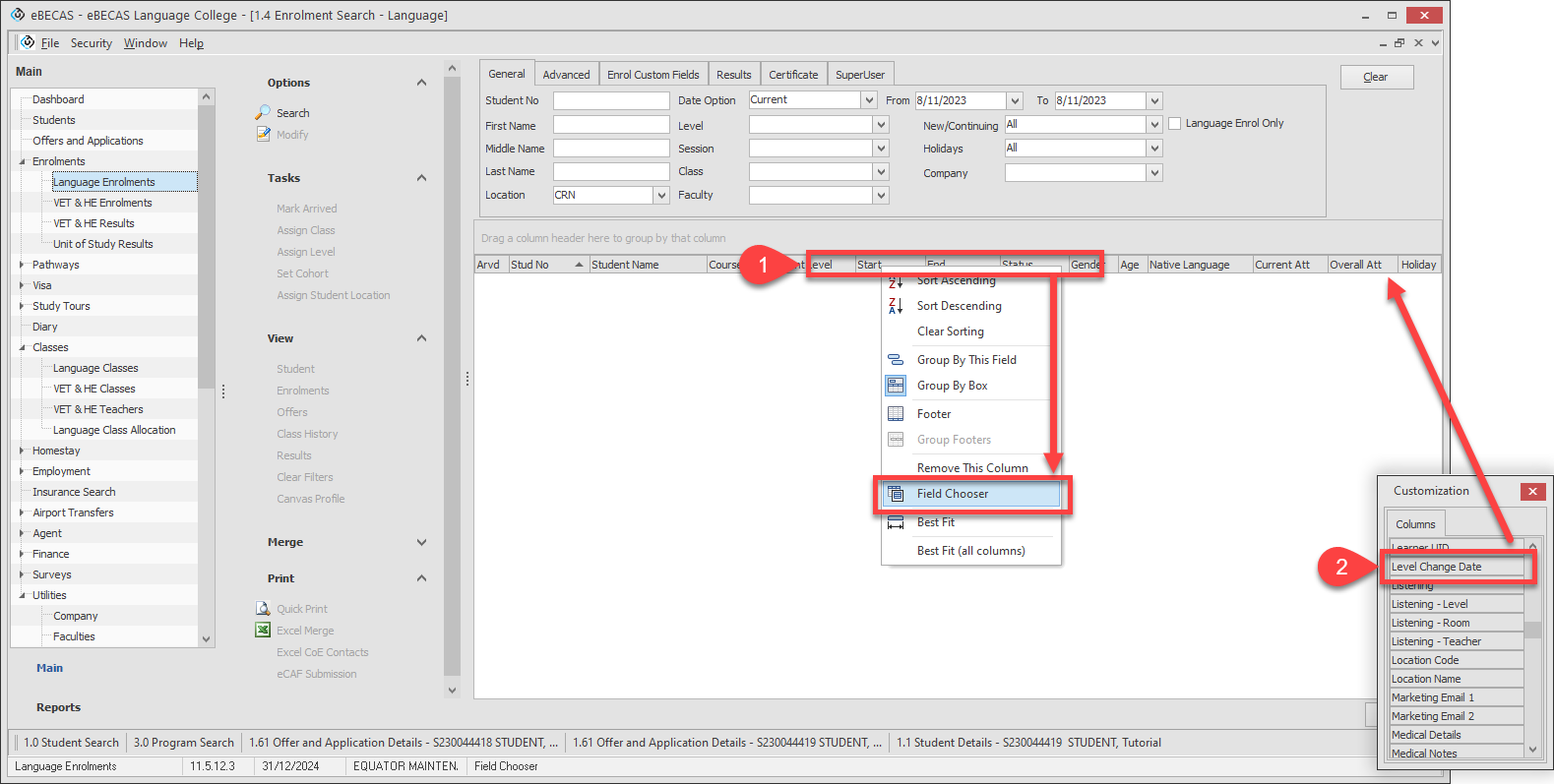 If you don’t see the Enrolment Language Level column, right click on the grid header, click on Field Chooser and drag & drop Enrolment Level from the list to the grid header.