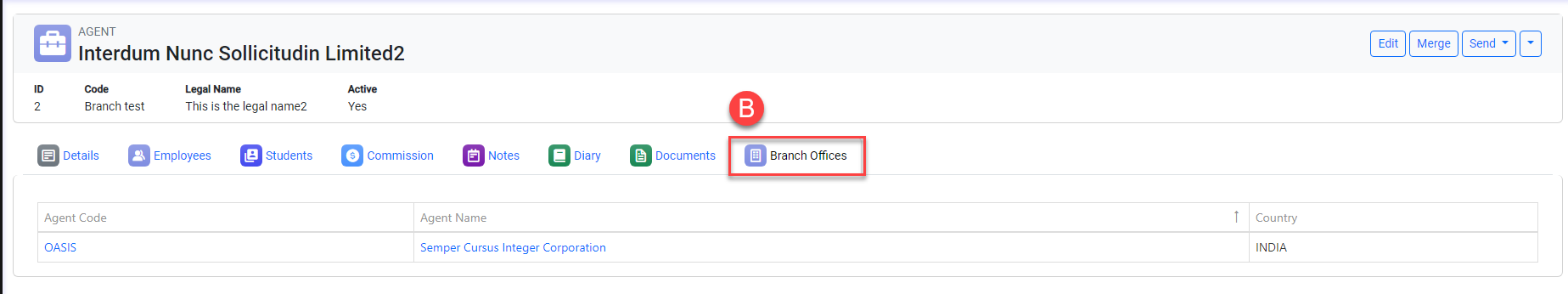 B. Branch Offices Tab: Only available if the Agent is a Head Office. This tab will display the list of the branch offices for the agent.