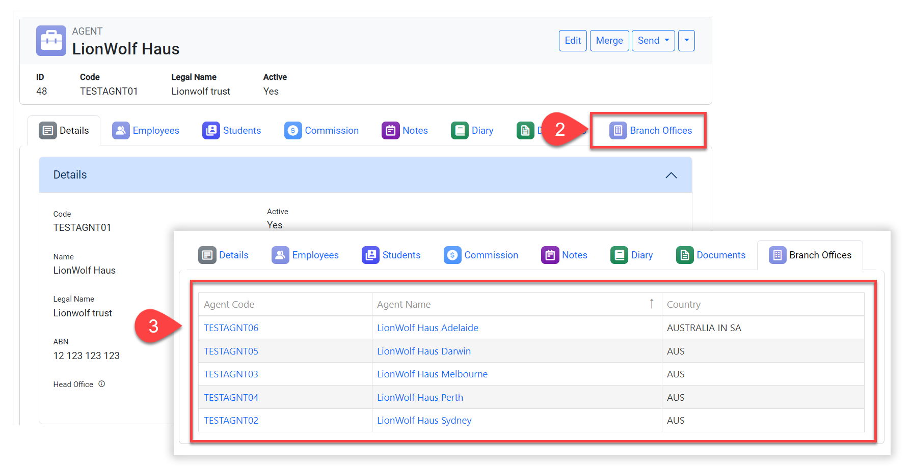 It's typical for agents to operate multiple offices (branches) in various regions or countries. Often, these branches have distinct agreements with your institution, such as different commission rates. Consequently, you must treat them as separate agents within the system while maintaining a connection between the branches and the central (head) office.