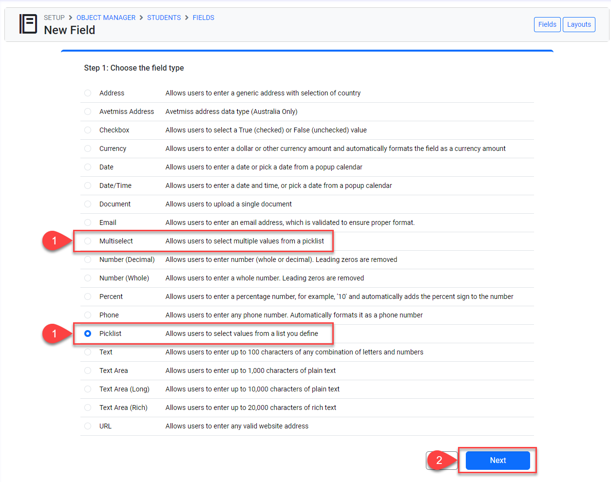 A Picklist can also be created at the same time when a new field of type Picklist or Multiselect is created.