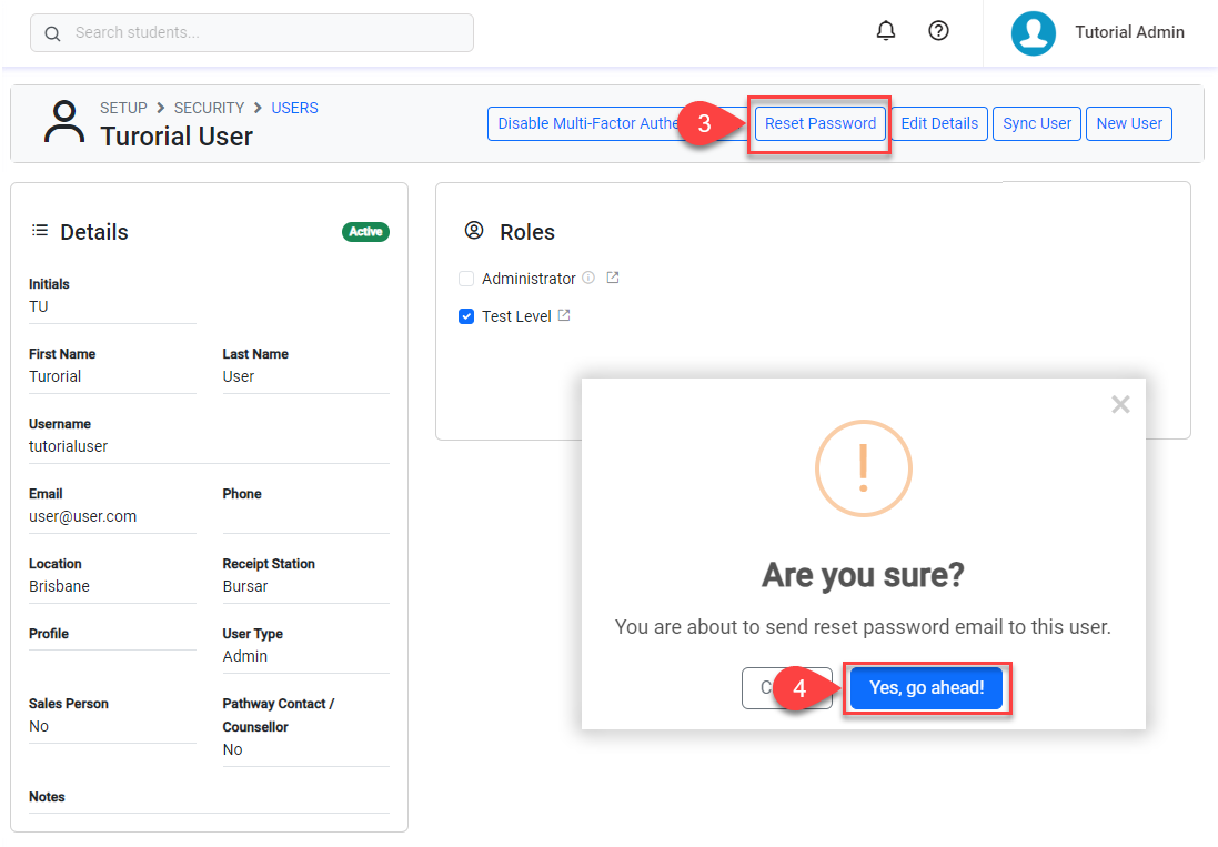 The user will be sent an email with instructions and a link to reset their password (the link is valid for 1 hour only).