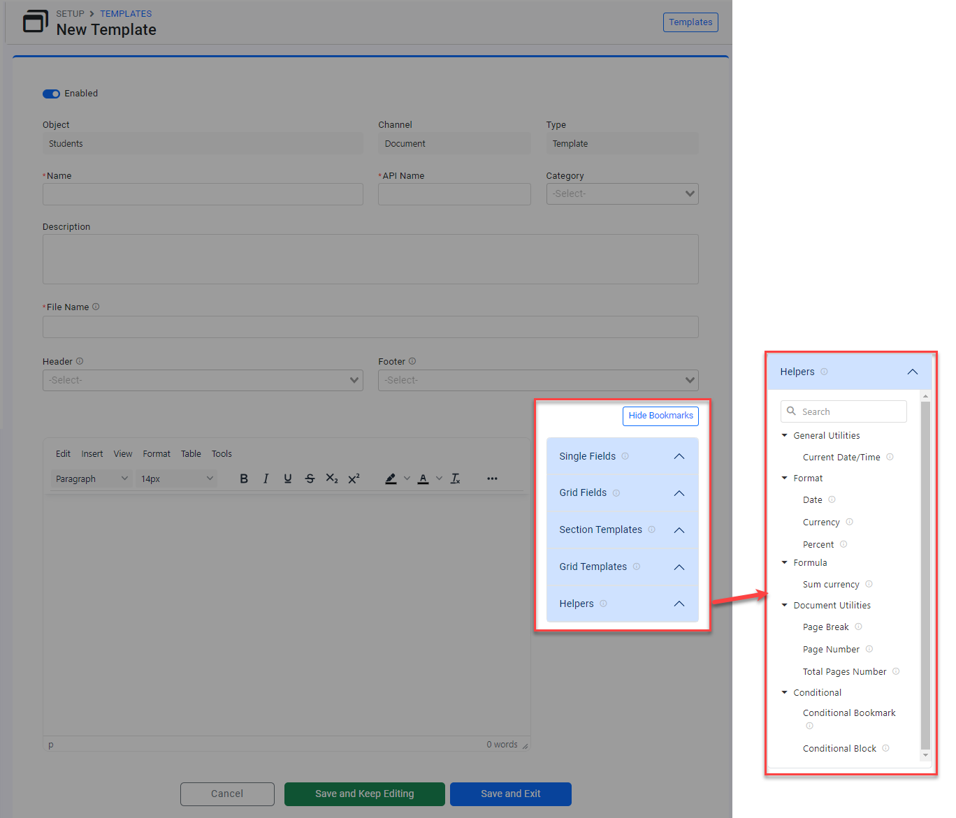 The helpers can be accessed from the bookmarks panel located next to the template content editor. You can access this panel when creating or editing a template.